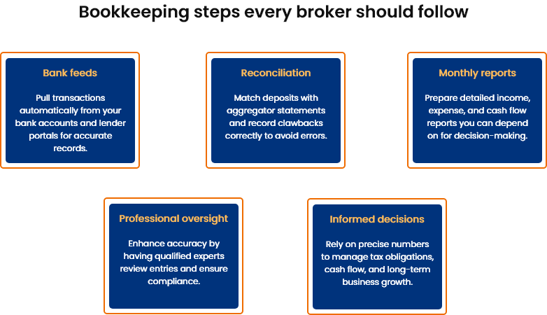 Unlike many small businesses, brokers deal with irregular commission income, clawbacks, and complex aggregator statements. These unique factors make reconciliation and forecasting more challenging, which is why consistent bookkeeping processes are especially important in the mortgage industry.